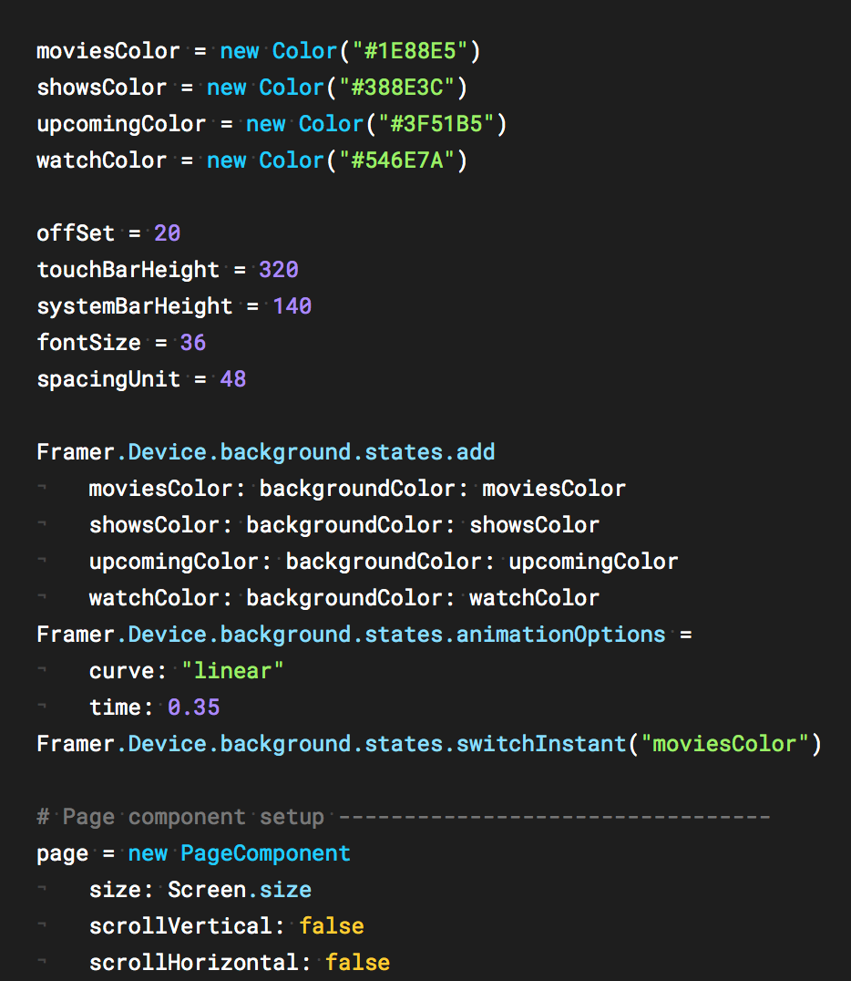 You can sew together screens up in Framer pretty easily. You do it with very minimal CoffeeScript. For many designers, this seems scary at first but virtually of the code you write is super simple.